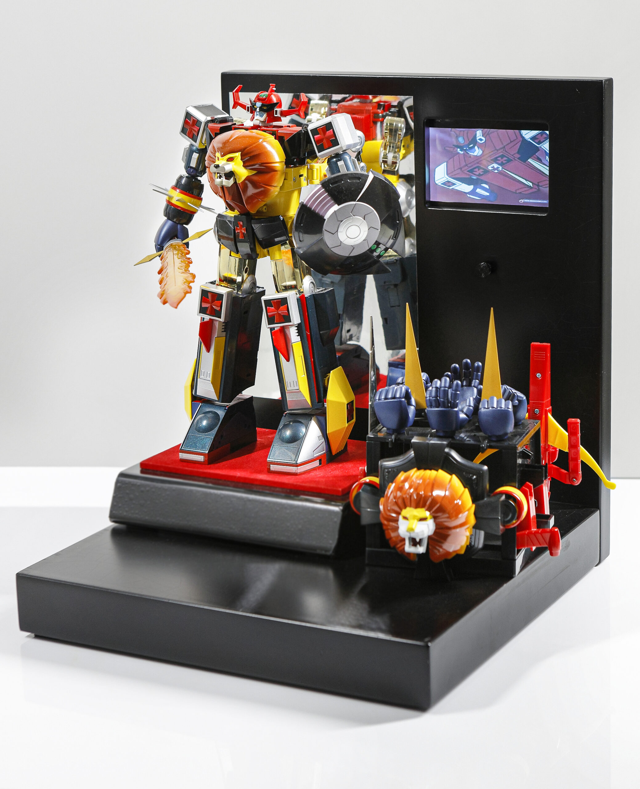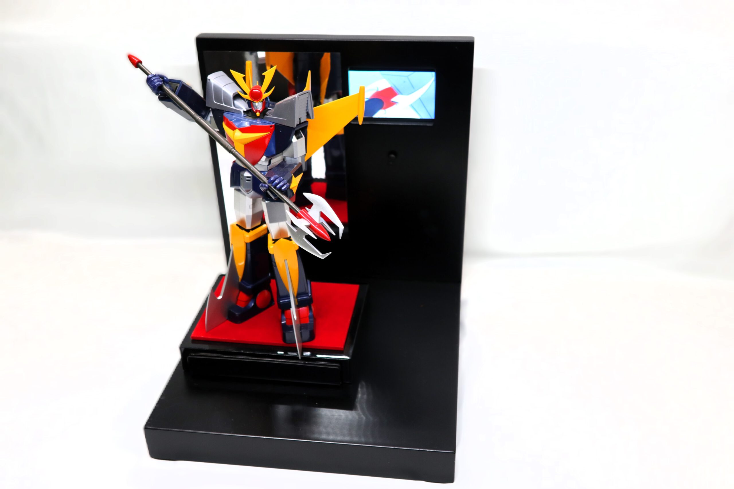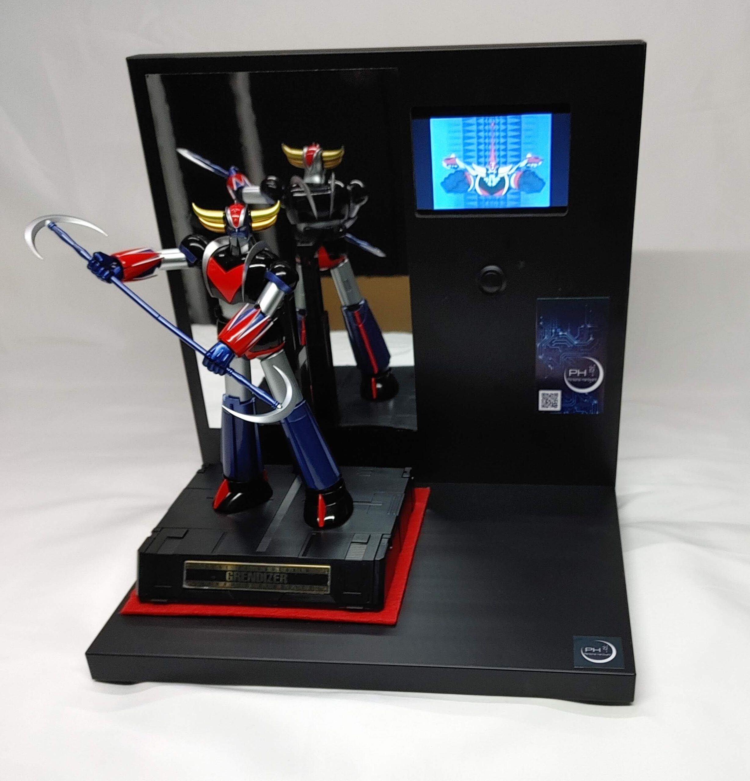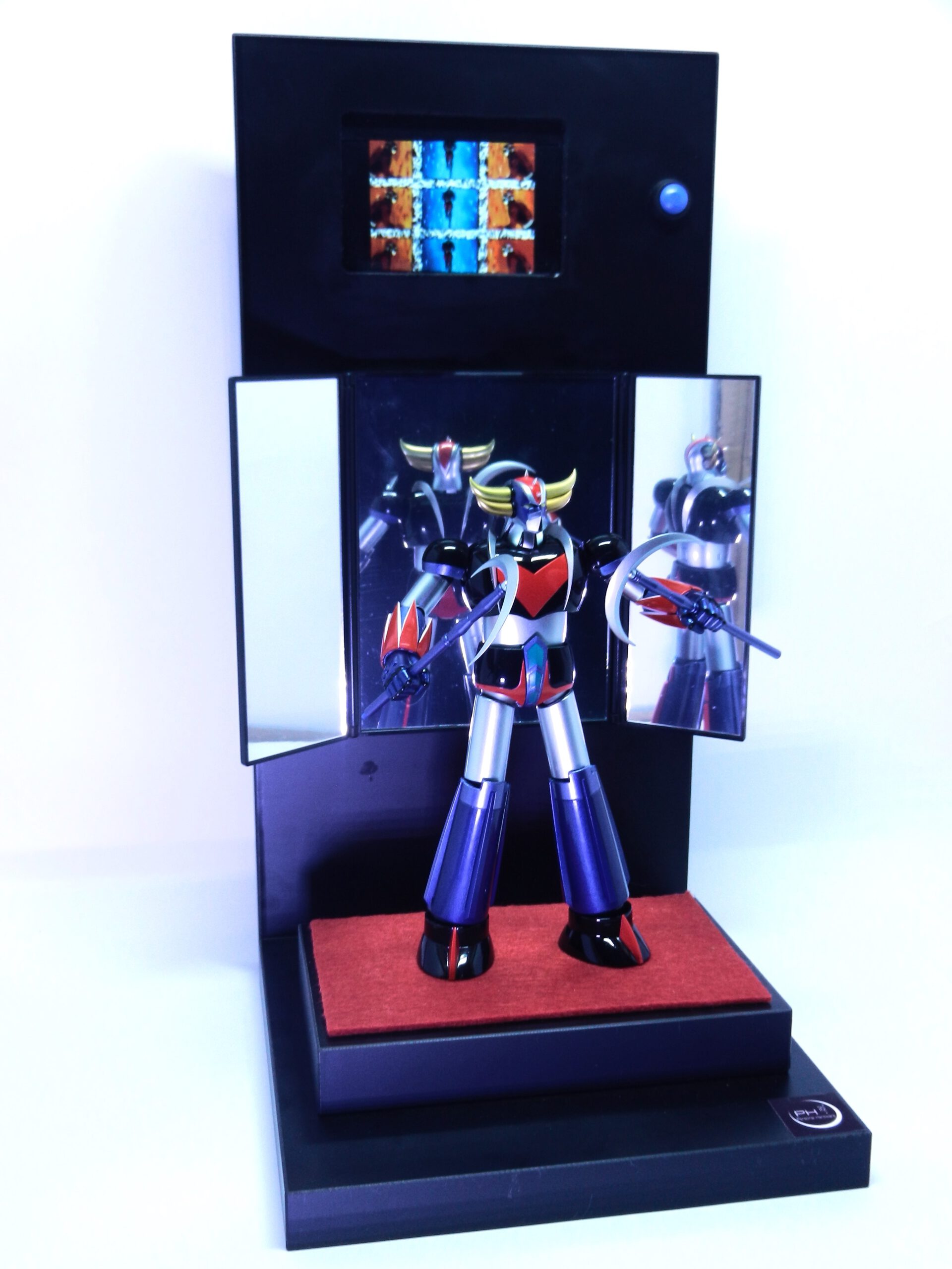 Espositore Multimediale per Action Figure e robot  Dotato di display  lcd  per riprodurre la sigla o video del tuo personaggio preferito Realizzato completamente in legno e metallo ​​​​​​​​​Dotato di un cavo usb posto nella parte posteriore per il collegamento al pc  per caricare i file  in  formato mp4